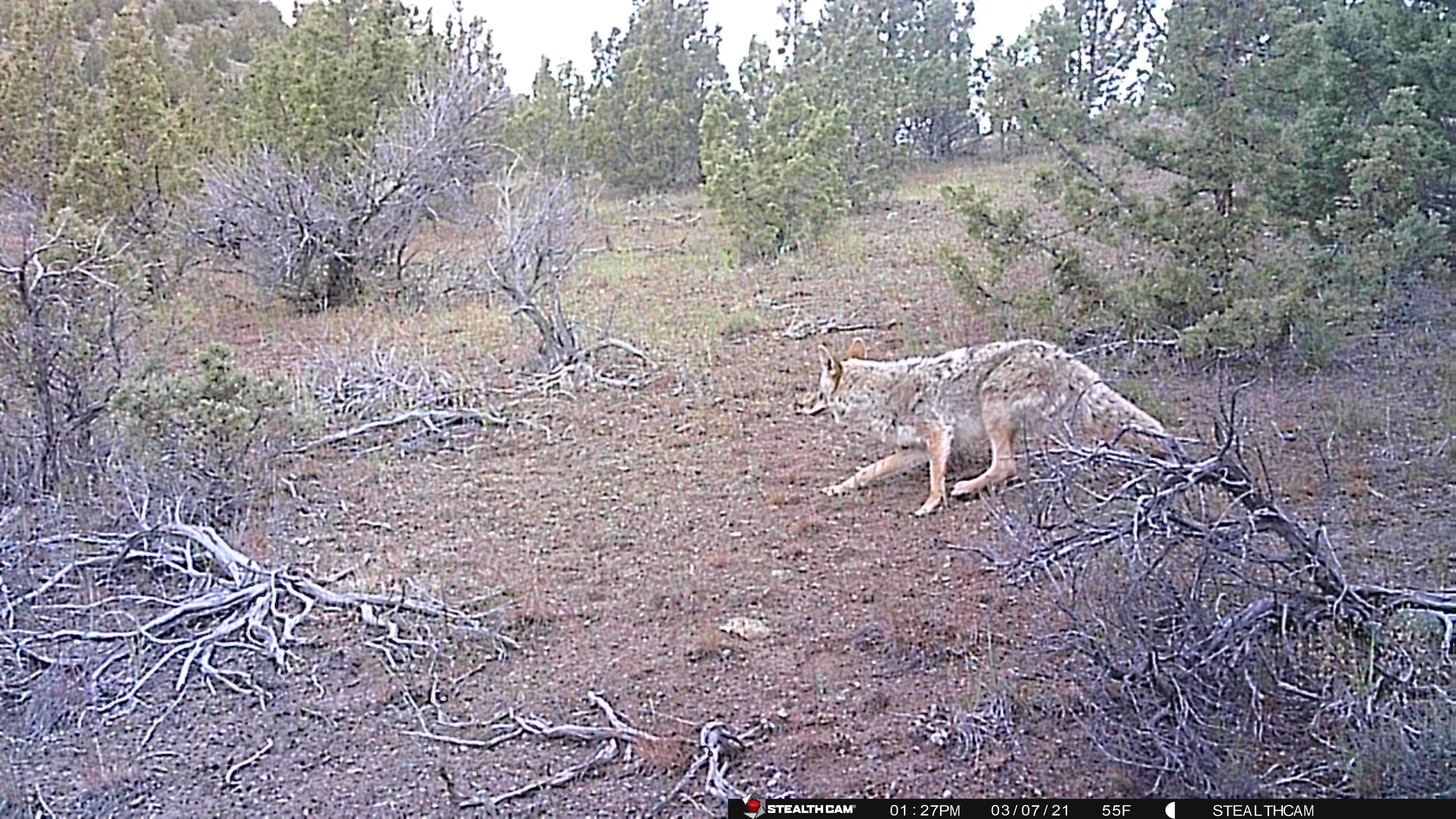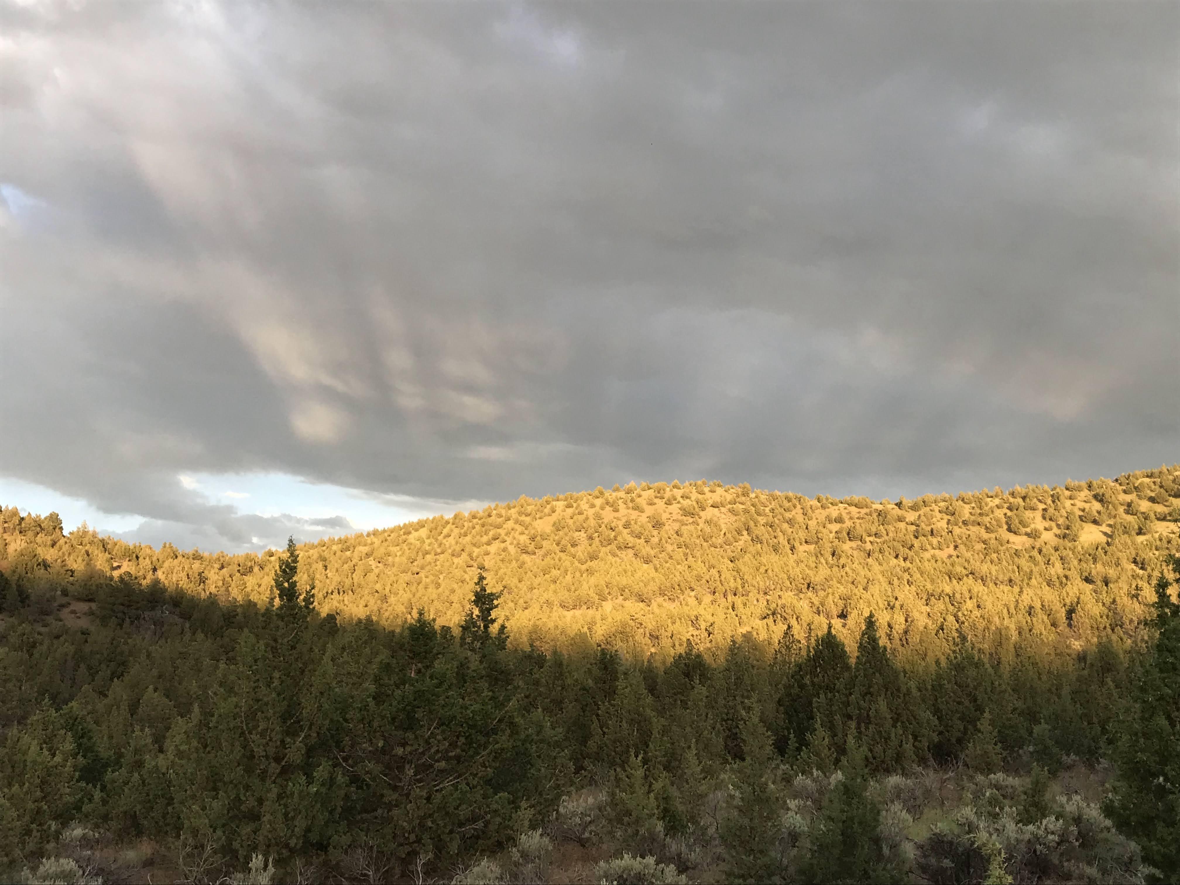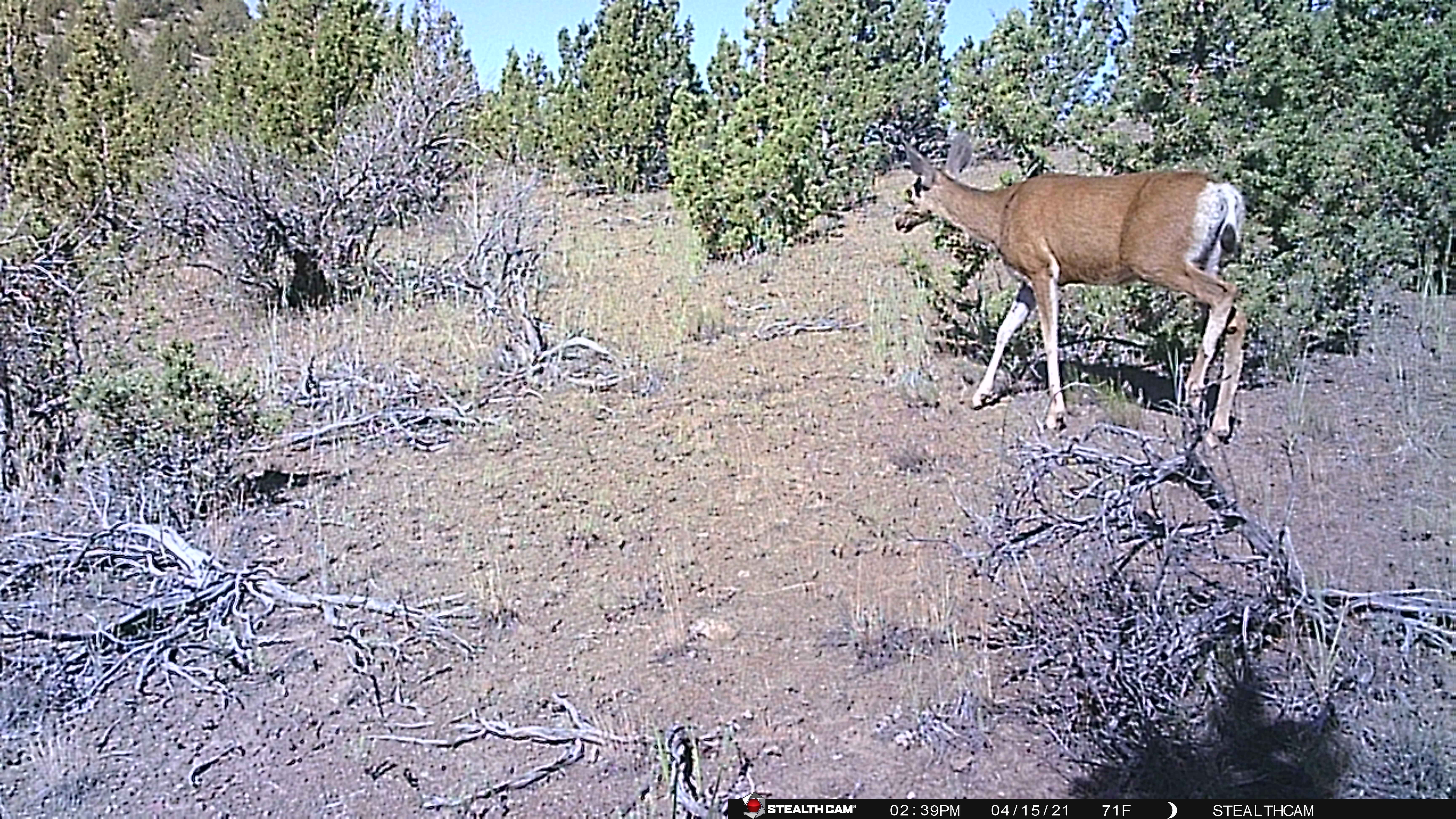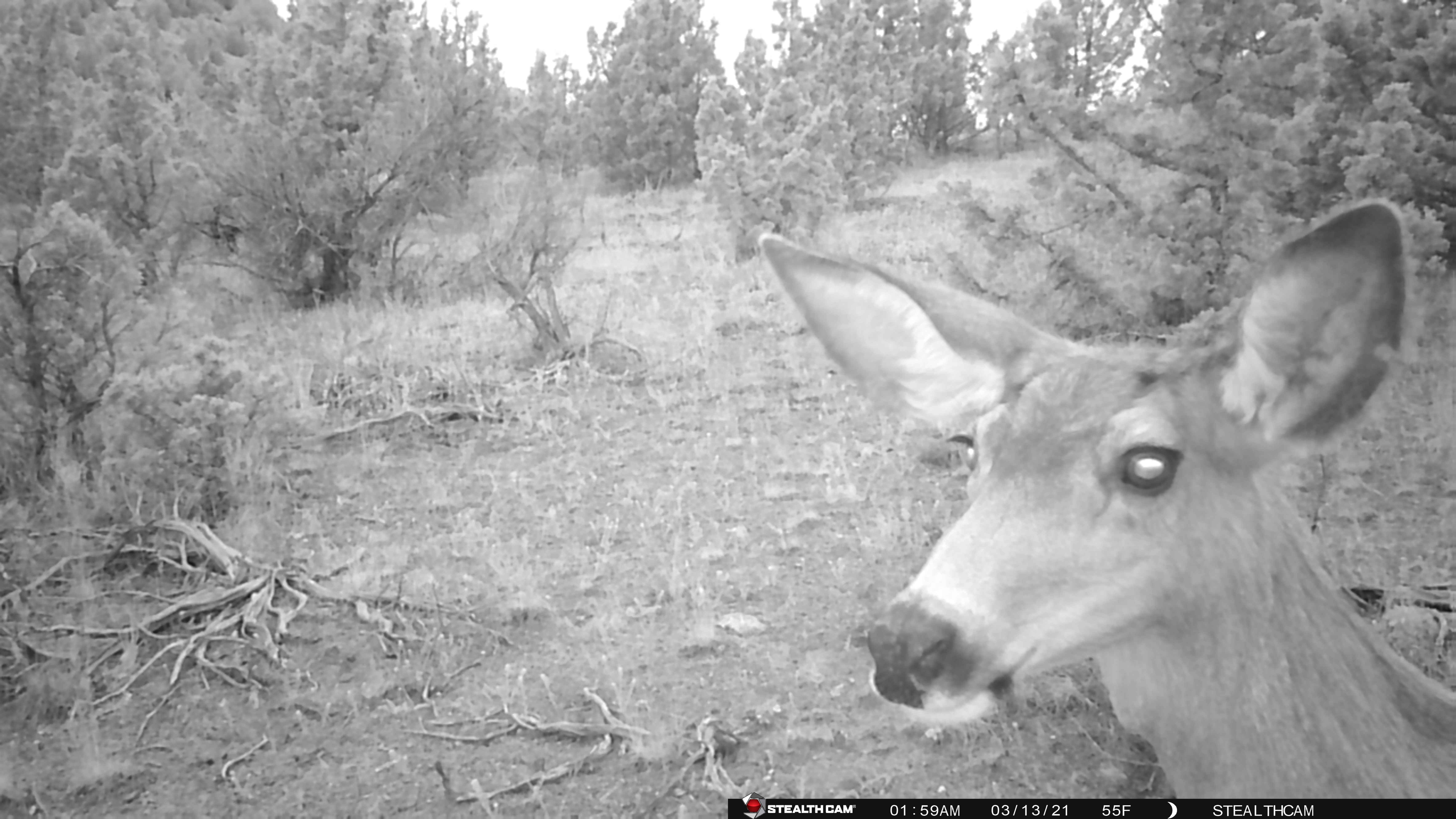 We arrived Friday, set up camp and unloaded the propane BBQ Steve picked up for $60 (used) so we could cook for everyone. Important note, in this part of Central Oregon fire bans start up around Memorial day weekend and go through Labor Day at least. This means no charcoal and no campfire – only propane. Steve’s mom and stepdad had a propane fire pit we were able to use in the evening for sitting and storytelling, we have since purchased one of our own because sometimes you just need a campfire. We grabbed the trailcams before it got too dark and tried to see what we got on the tiny screen because I forgot my computer (doh!). Steve placed his camera down in the lower part of the ravine and I placed mine on the trail ascending the larger bluff on the top of our property. Steve only had one picture, but it was absolutely a buck with fuzzy antlers! I got a bit more action, no buck, but did get a burst of shots of a coyote taking off up the trail. So cool! My camera also got a couple shots of a doe, one really close up which made all of us laugh pretty hard.