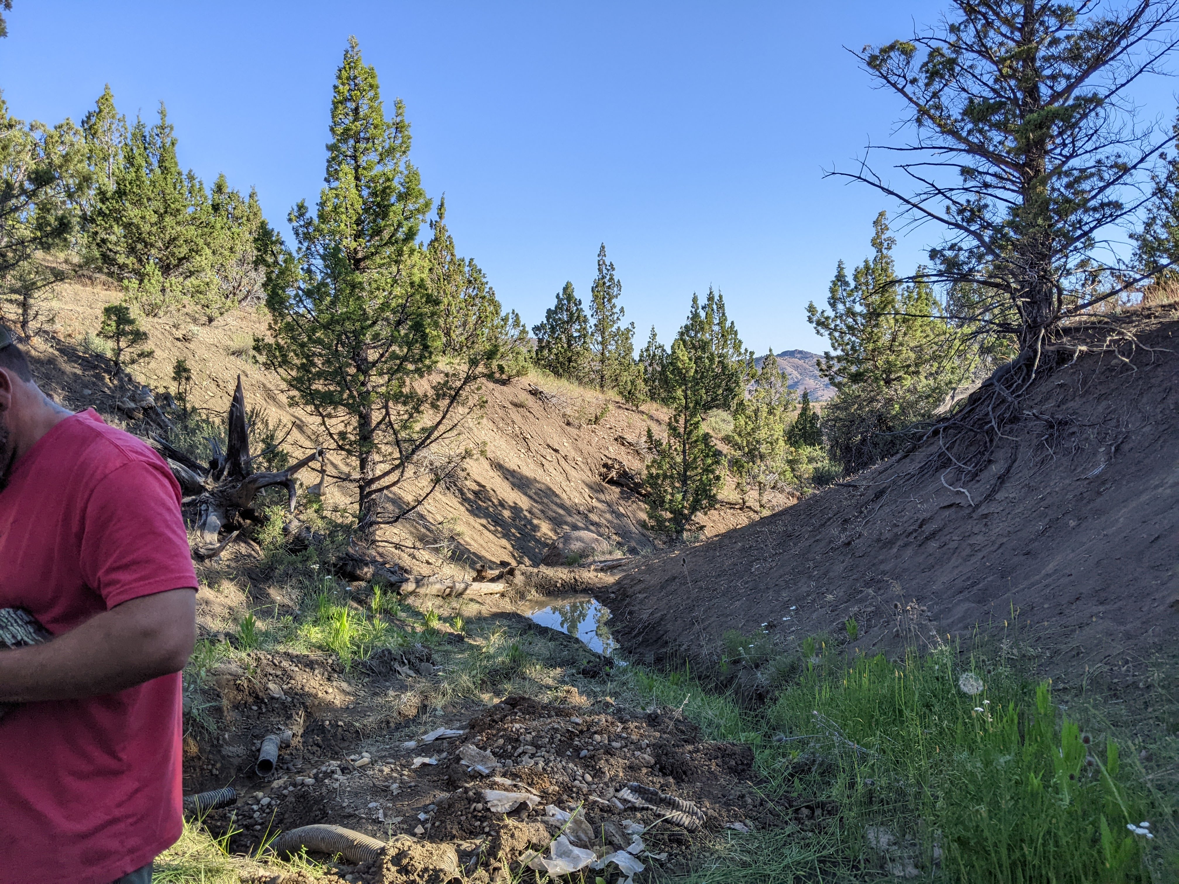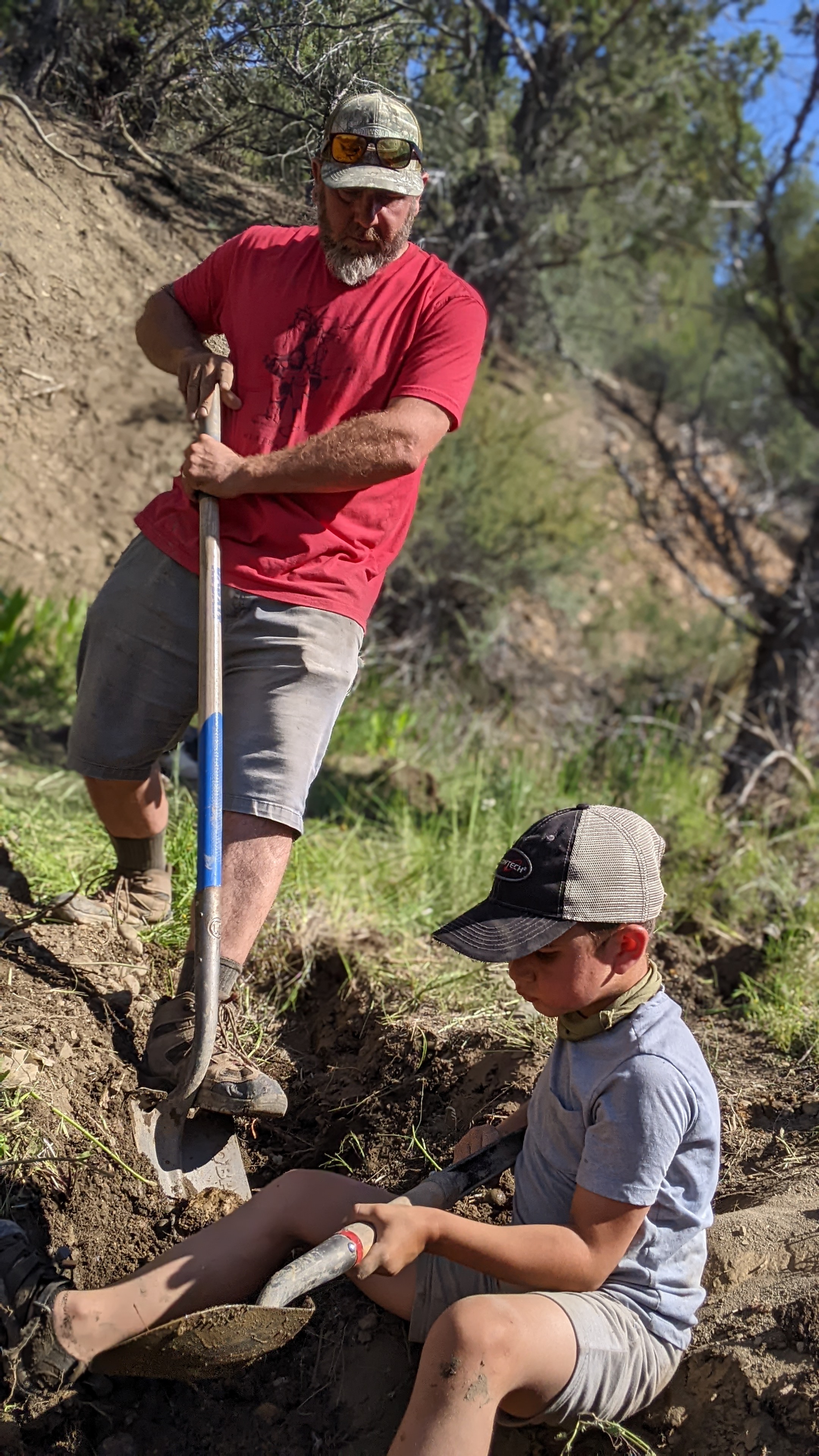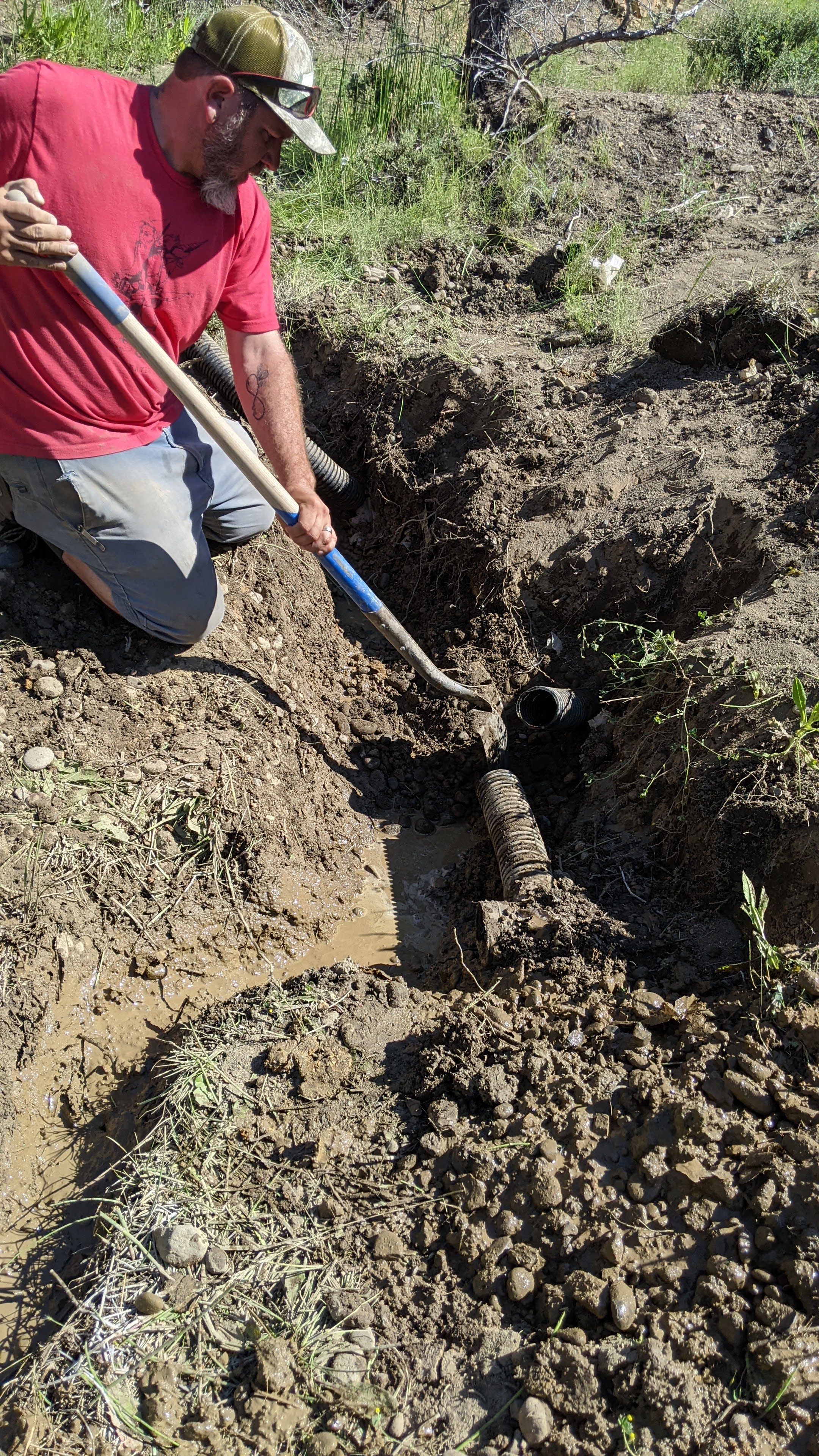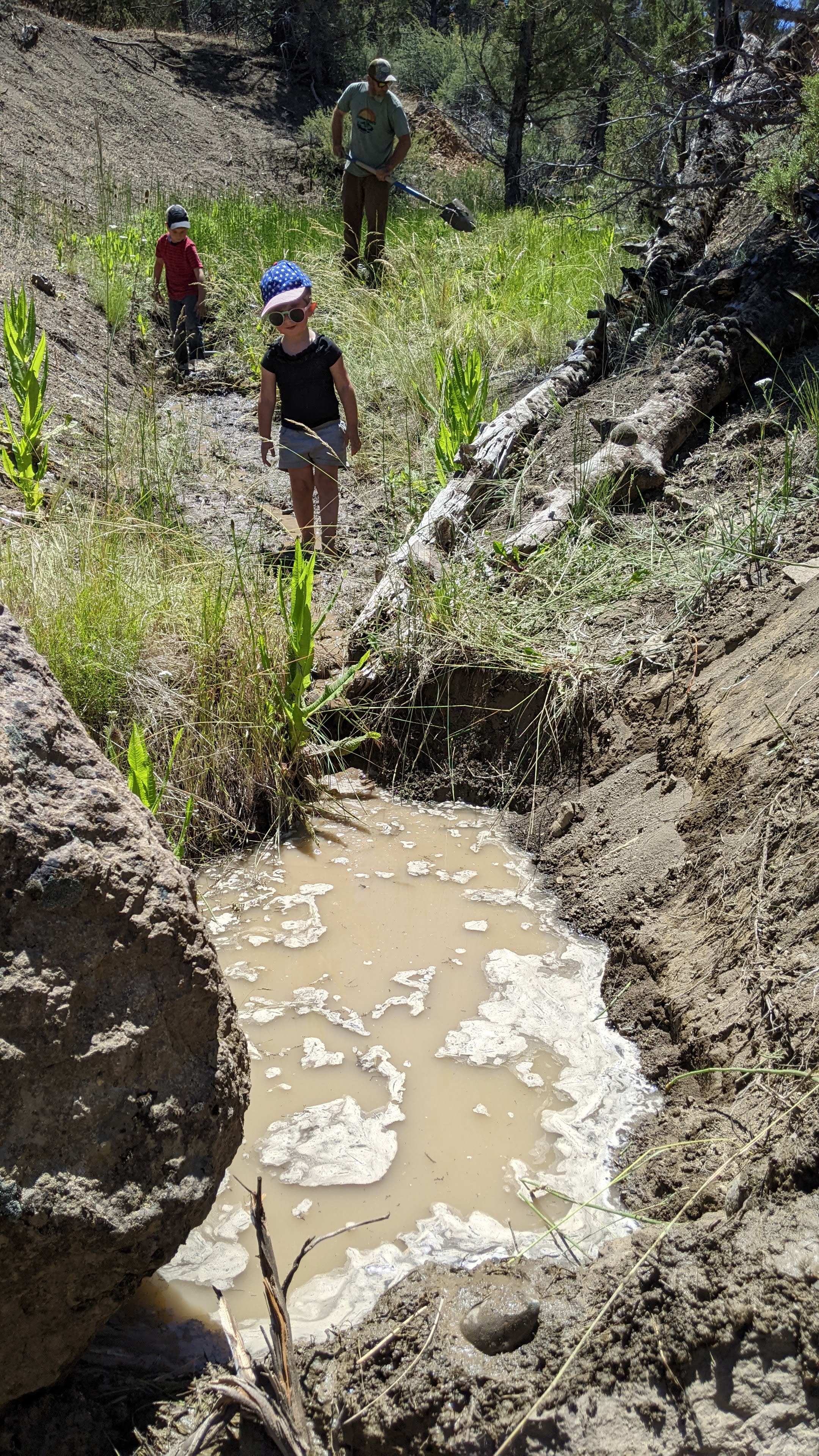 Saturday we hiked around and drank coffee most of the morning before Steve, my mom, the kids, and I decided to go hike the ravine with the witchin’ sticks (dowsing rods) to see if we could find spring water near any of the damp areas we had noticed in the past. We decided to start at the top of the property line and work our way down. We passed several spots covered in snake grasses and wild flowers, not the typical sagebrush and Juniper trees we are used to seeing throughout the rest of the terrain. We got to the top of the property and noticed an area that was not only damp and grassy, but had some standing water! Steve poked around with a shovel and not two shovelfuls into the dig we had a significant pool of water coming out of the ground! AHH! We all worked to start trenching a path, building a couple dams, and following the stream back to see if we could locate the source of the spring. We found some strange corrugated tubing, round rock definitely not native to the area, and plastic sheeting. Had someone built a French drain here once before? We heard rumors from the neighbor that there were squatters back in the 60’s and 70’s trying to grow the pot out in these parts on land that was not theirs, and we had seen evidence of old shelters on this property, but these tubes are in 15ft ravines, it was mind bottling… Check out the pictures and let me know what you think. Keep in mind – there is NO RECORD of anyone ever legally inhabiting this piece of property. This seems like such a huge endeavor for a squatter with no machinery. Then I looked at what we were able to excavate by hand in just two days. Nothing seems impossible.
