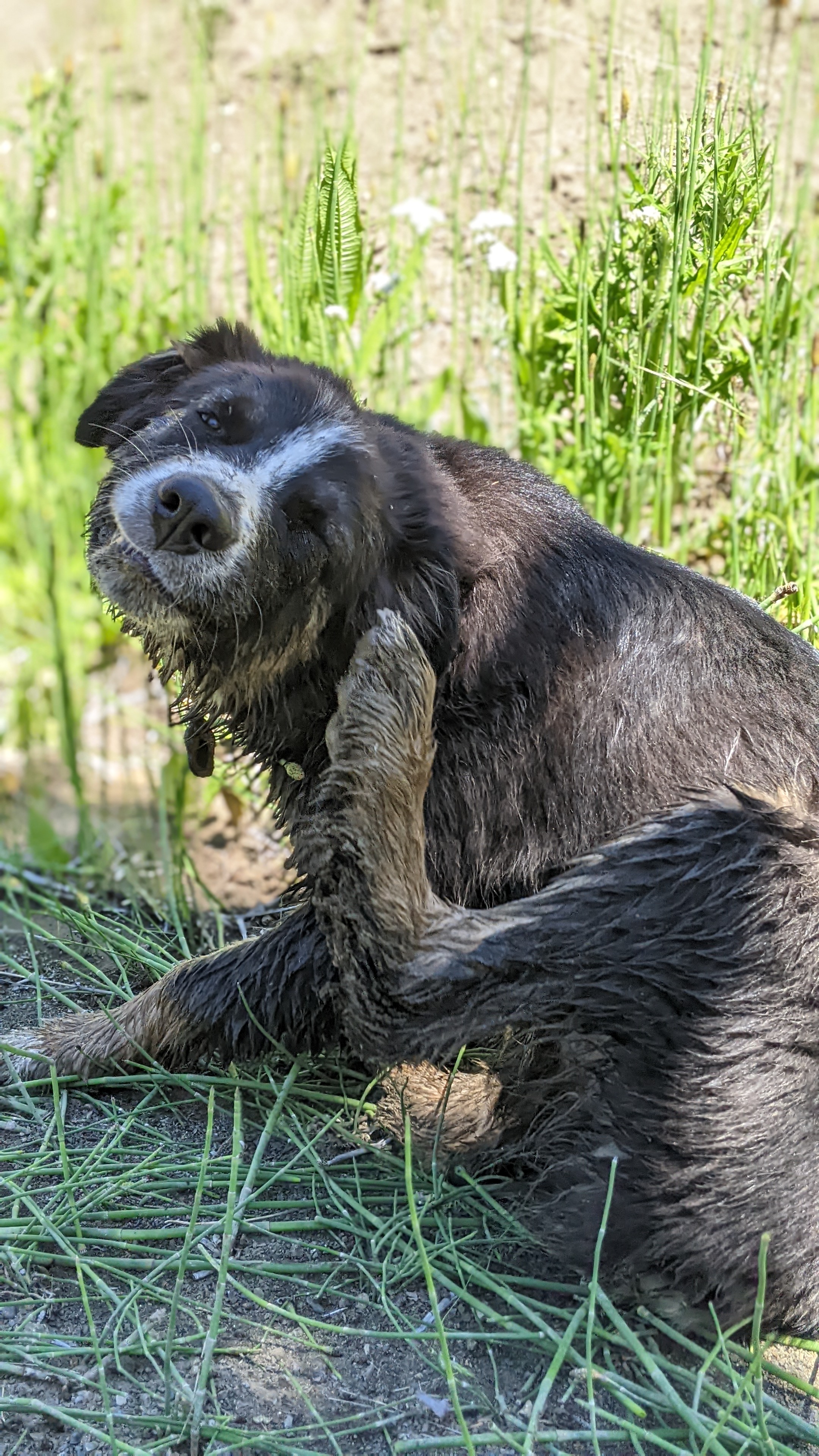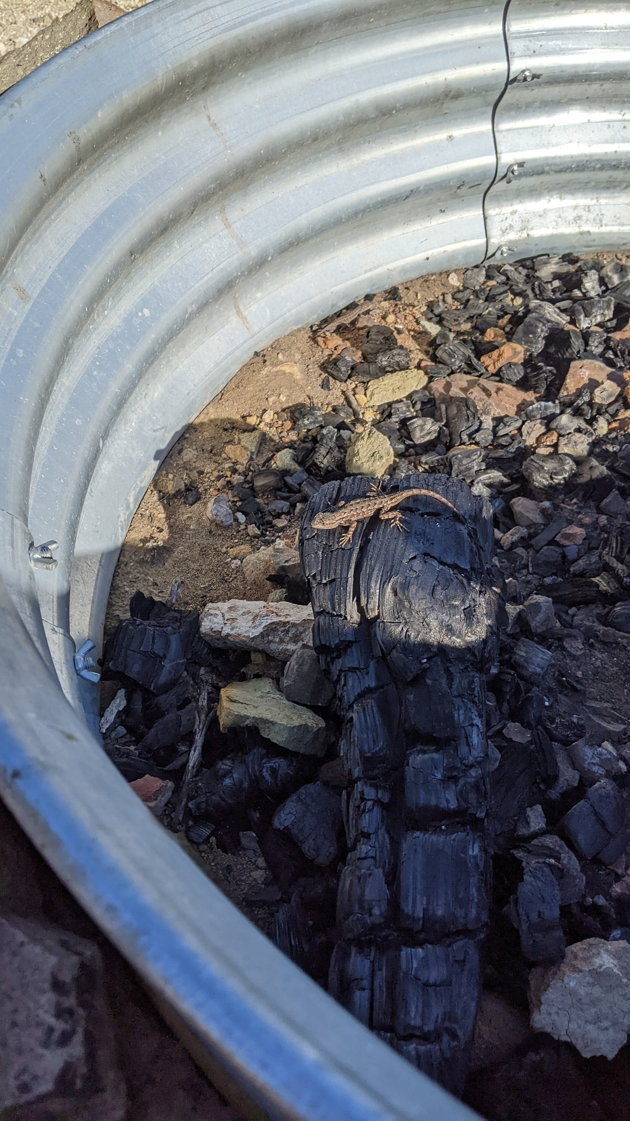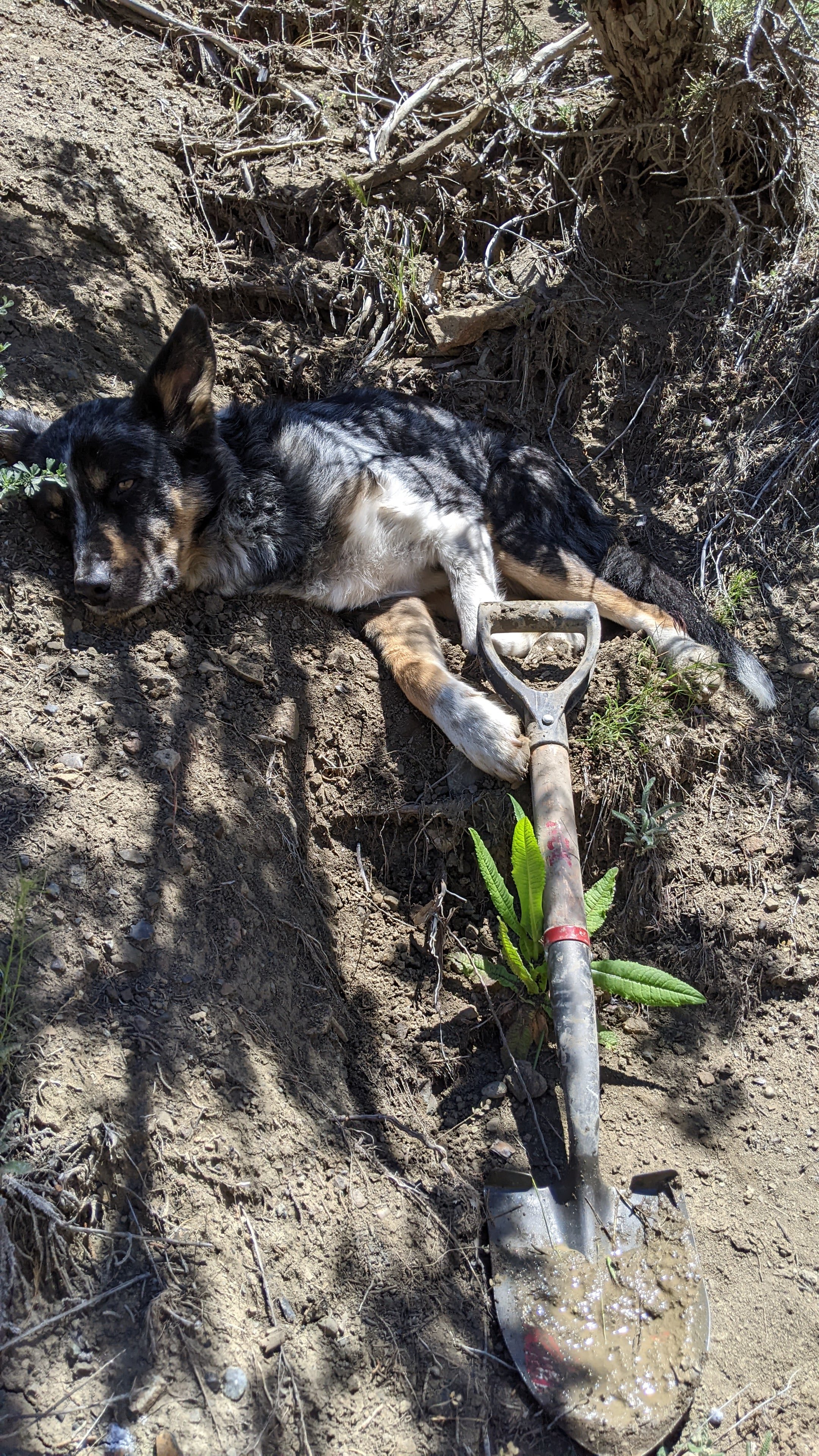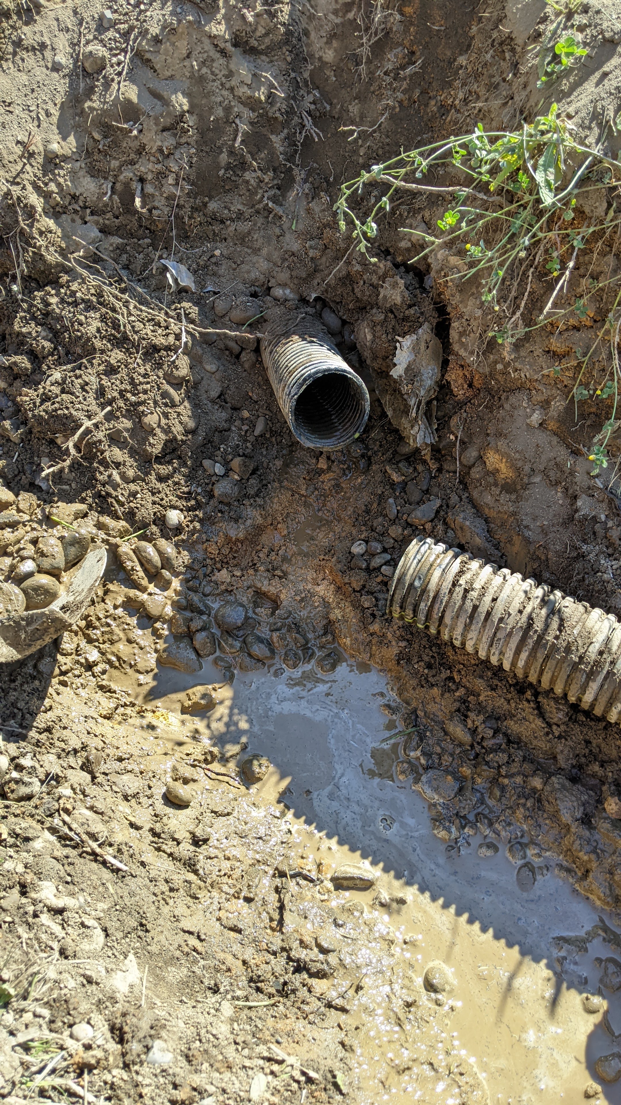 Saturday we hiked around and drank coffee most of the morning before Steve, my mom, the kids, and I decided to go hike the ravine with the witchin’ sticks (dowsing rods) to see if we could find spring water near any of the damp areas we had noticed in the past. We decided to start at the top of the property line and work our way down. We passed several spots covered in snake grasses and wild flowers, not the typical sagebrush and Juniper trees we are used to seeing throughout the rest of the terrain. We got to the top of the property and noticed an area that was not only damp and grassy, but had some standing water! Steve poked around with a shovel and not two shovelfuls into the dig we had a significant pool of water coming out of the ground! AHH! We all worked to start trenching a path, building a couple dams, and following the stream back to see if we could locate the source of the spring. We found some strange corrugated tubing, round rock definitely not native to the area, and plastic sheeting. Had someone built a French drain here once before? We heard rumors from the neighbor that there were squatters back in the 60’s and 70’s trying to grow the pot out in these parts on land that was not theirs, and we had seen evidence of old shelters on this property, but these tubes are in 15ft ravines, it was mind bottling… Check out the pictures and let me know what you think. Keep in mind – there is NO RECORD of anyone ever legally inhabiting this piece of property. This seems like such a huge endeavor for a squatter with no machinery. Then I looked at what we were able to excavate by hand in just two days. Nothing seems impossible.