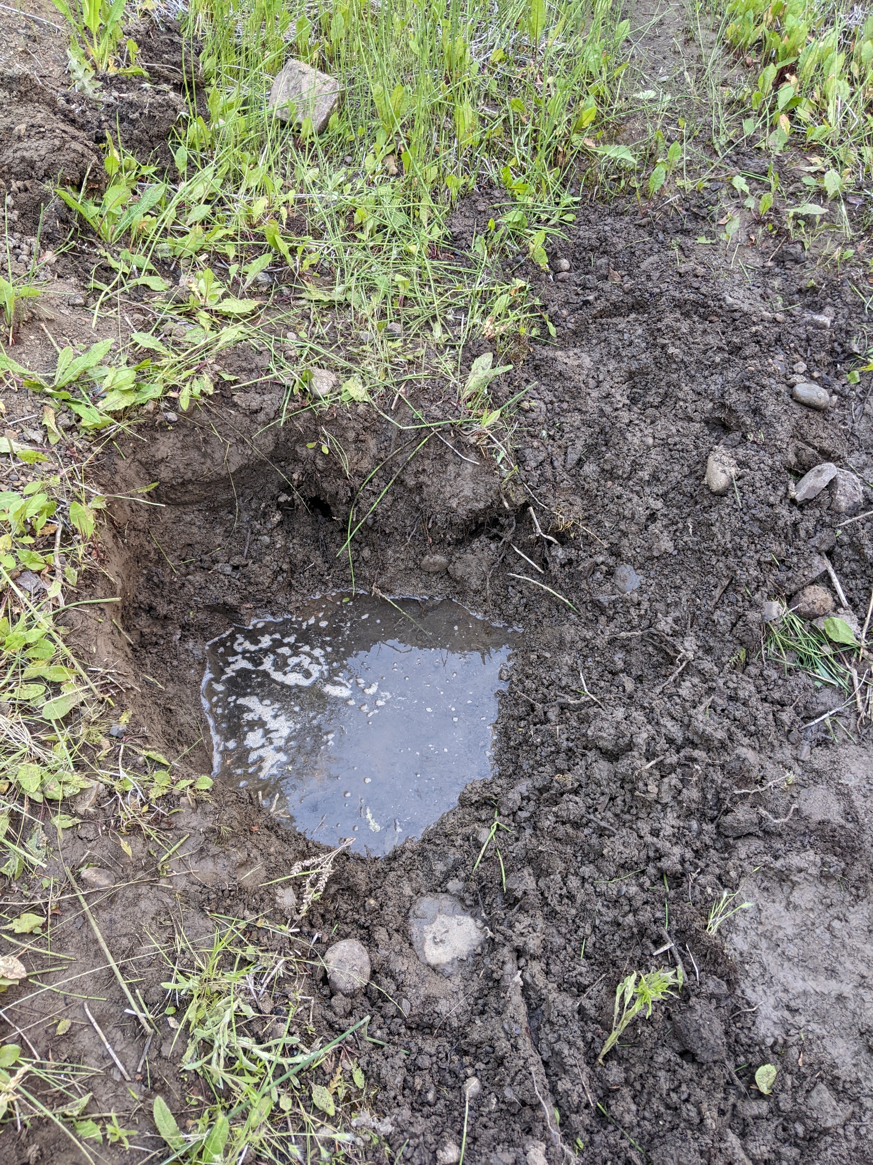 Sunday I took the witchin’ sticks down the ravine a bit to try and see if I could find any other ground water and about 100ft down from the spring we found Saturday I had a really crazy reaction, stepped on a rock right in front of my foot at that spot and water started bubbling up! Holy sh*t – is this happening again? STEVE! GRAB THE SHOVEL! We dug about 18 inches down and under a giant rock was another little stream of water!! We dug about a basketball sized hole and came back Monday to find it full and seeping down the ravine.