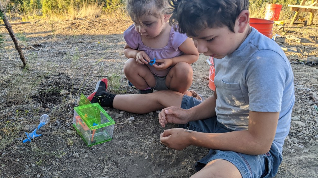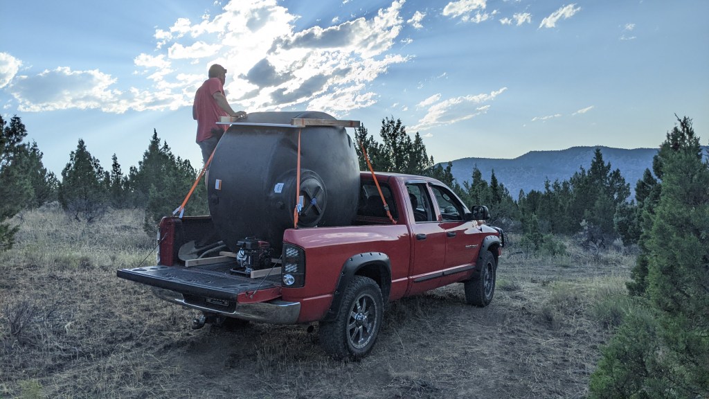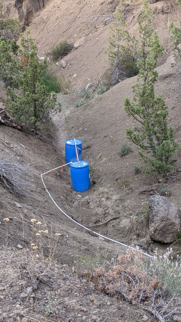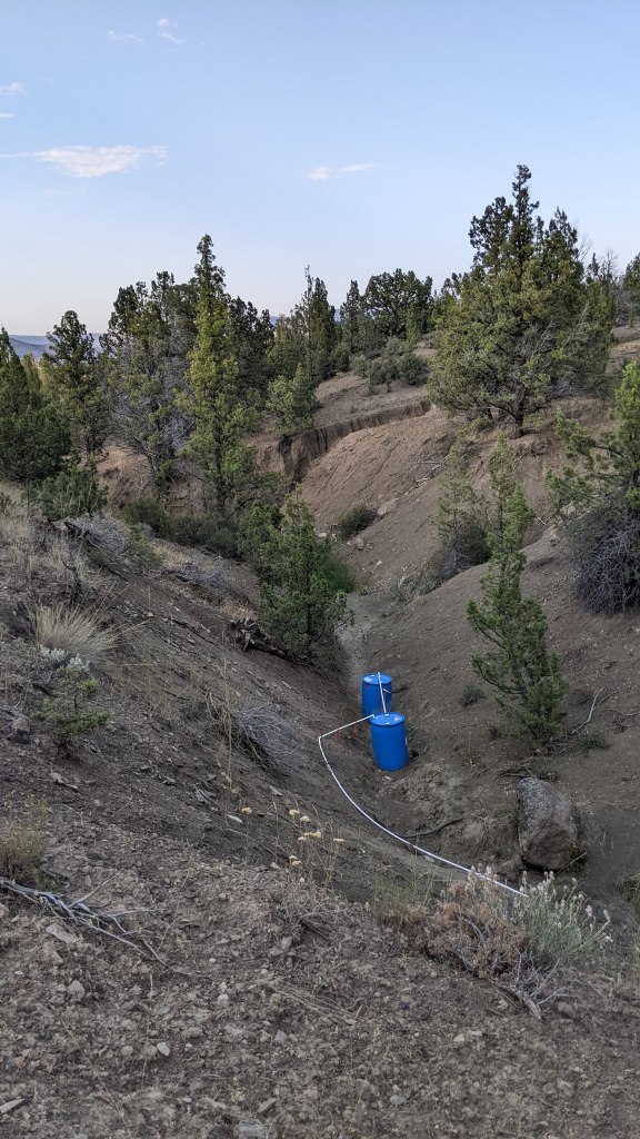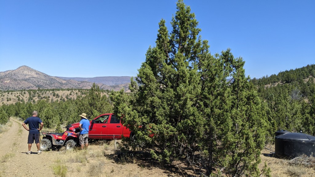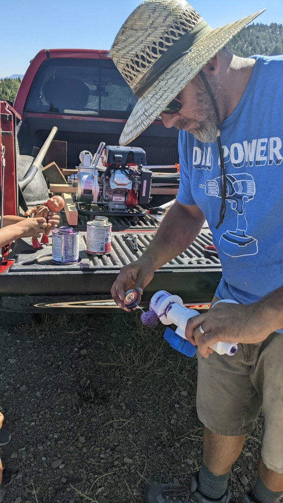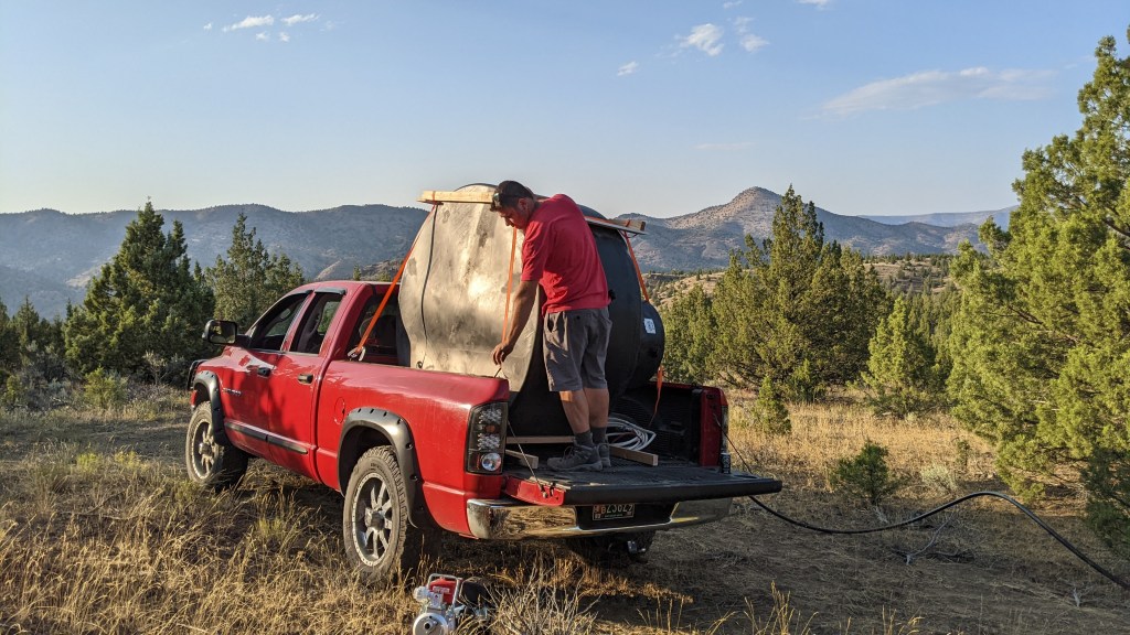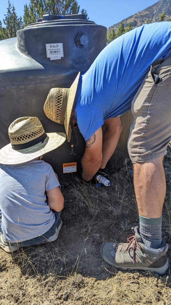 Next up, getting the water from the tanks in the ravine to the new potable water tank. Fun fact, potable water tanks are black to keep algae from growing. As we were getting this staged up the Ranger alarm went off and indicated that our neighbors from the top of the mountain above us were coming down to see what we were up to. We got to spend a lot of time with these two lovely people and really learned SO much from them. As a matter of fact, we are starting to redraw our plans to do what they are doing – living part time off grid. The more we spoke to them about it, the bigger my dream eyes got. He was so excited about our water find and talked to us at great lengths about how quirky the water rights language is in the CCR’s. Things we knew, obviously, but still weird to hear that if someone finds water on my property that they can develop it if they so choose. They cannot store articles on my property, but if they want to run 10 miles of hose from my ravine to their house, they can. Crazy, right? The boys all went down to the ravine to start working the pump and how to get the water from the little tanks to the big tank up top. It worked, and in the end, we are so lucky the neighbors stopped by because his engineering brain really helped Steve when it came to navigating the gravity part of this scenario. We pumped just about 100 gallons into the new tank, but that was it because the spring was, say it with me… Bone… Dry…