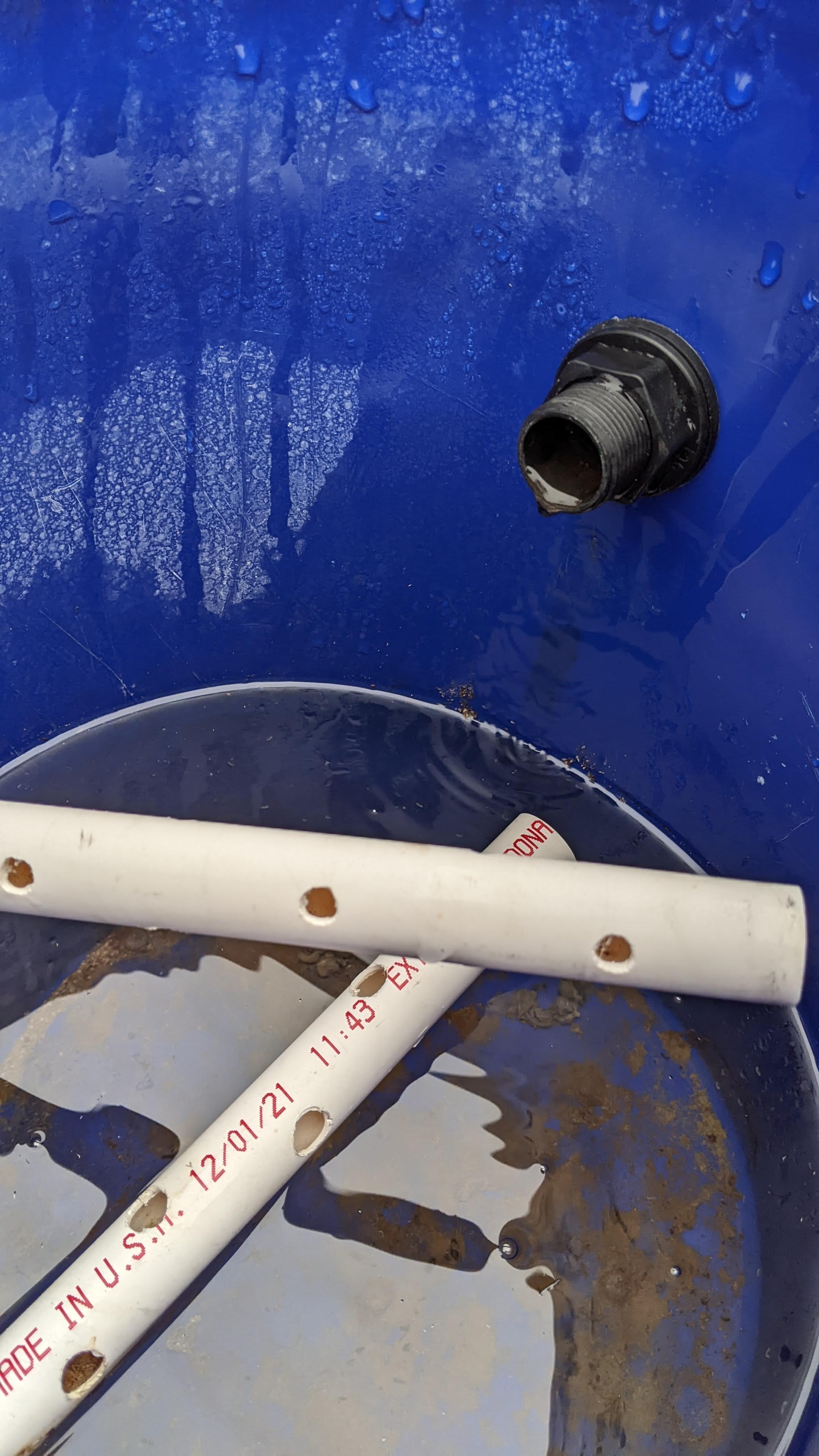 In other great news our spring was already running again and our 550 gal tank didn’t freeze! Victory! From what we can gather the spring started running sometime that month, March, and last year it dried up around August. This means we have five months to collect as much as we can. Our plan began. We realized that some of our pipes that had not been glued in our spring collection system came apart, so we glue those. The 60 gallon barrels are blue so we noticed that there was algae coming out of the overflow pipes. These barrels need to be replaced by a black tank and something larger. We will plan to bring a 275 gal cube and paint it black, to replace these two 60 gal barrels.